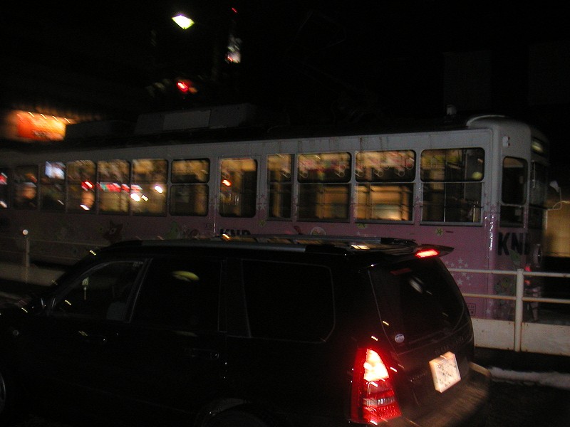 目の前の道路に路面電車が走っていました。路面電車って可愛いですね