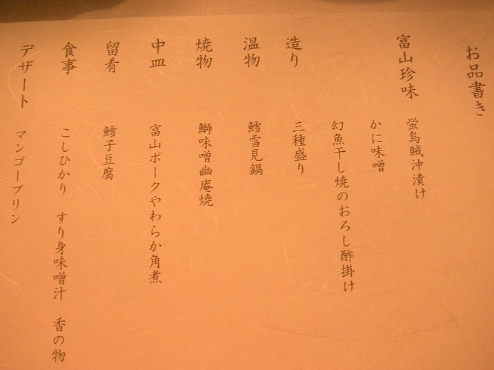 夕食はツアー曰く“富山味覚満載の会席膳”。クロークのあるフロアの宴会場のような場所での食事です。最初から写真のように殆ど全部用意されているタイプの食事だったのですが、スタッフの方が食べ終わったお皿をどんどん片付けるのが気になりました。なんだか急かされている感じがして...。味はまずまずでした。ただ、私の“富山”のイメージは“美味しい!”だったので、そういう意味では特に光るものは感じませんでした。写真↓結構ブレてます