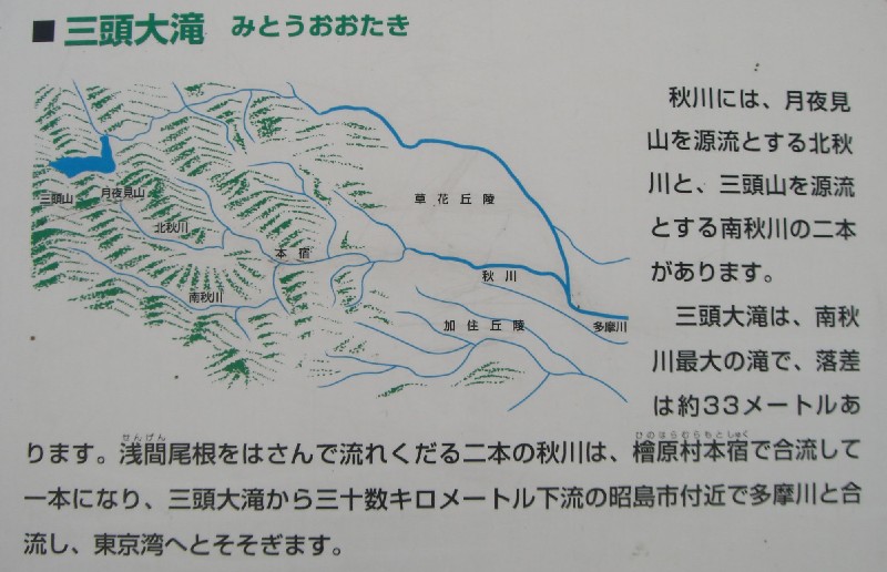 今回のお出かけのメインは奥多摩の山梨側にある小菅の湯(2004/3/23の記事)だったので、一番手頃な三頭大滝コース(散歩向き約1時間)を歩いてきました。都民の森の駐車場から森林館まで傾斜のキツイ坂道と階段が続きます。三頭大滝までのコースではここが一番きつかったです(笑) 森林館から大滝の路を進むと途中左手にモミの木の案内板が出てきますが、まずは目的地の三頭大滝へ向かいます。三頭大滝は南秋川最大の滝でその落差は33メートルなんだそうです。
