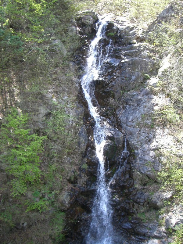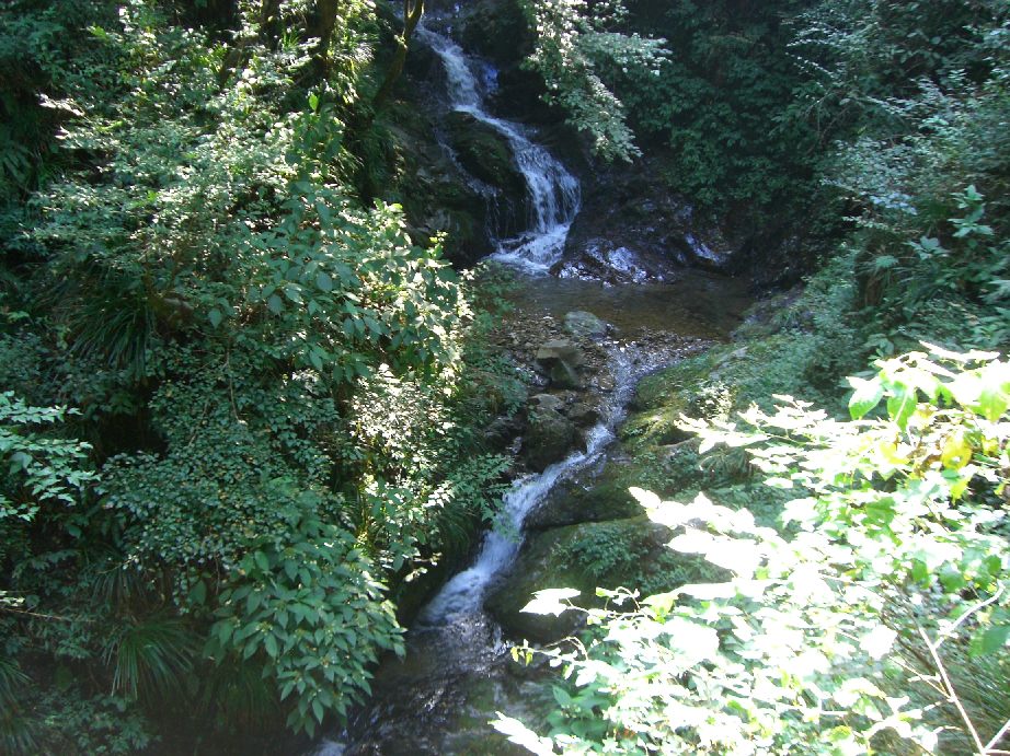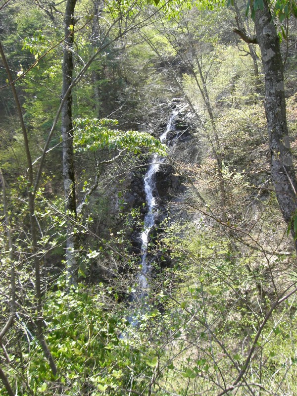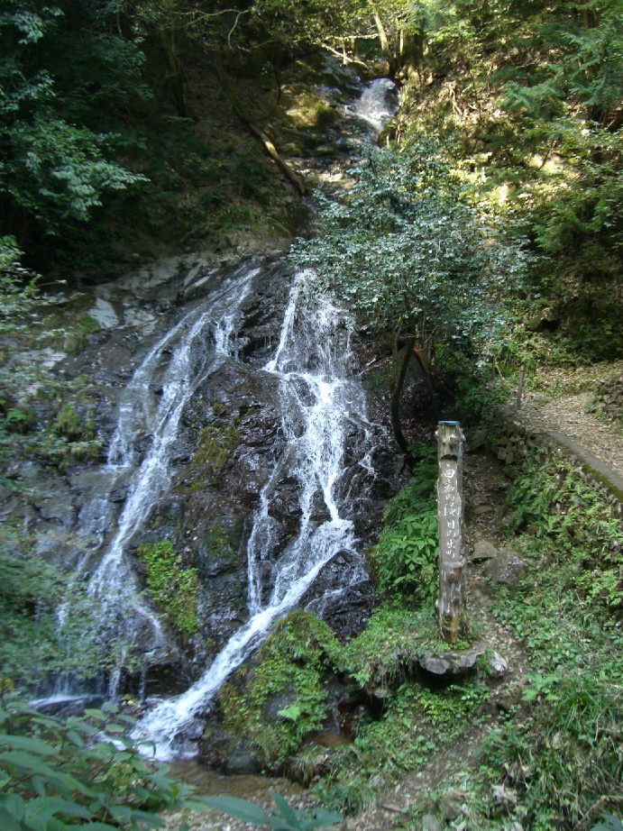 渓流沿いにまた少し歩くと滝が出てきます。ここに“白岩の滝”という案内標識(上の写真 右下)が立っています。すぐ側にある不動橋を渡ると見晴らし場があり滝を正面から眺められます(下の写真)。