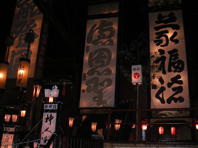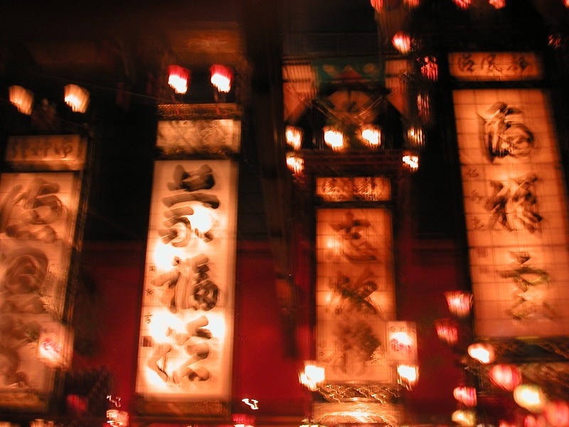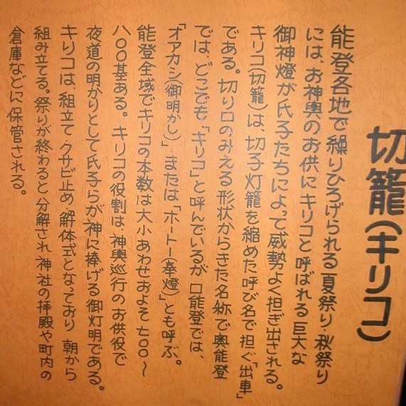 入り口には江戸時代のキリコなど年代モノの大きなキリコが飾られています。重さもかなりの重さなのだそうです。現在のキリコは電信柱などの高さにあわせたサイズになっているそうです。手ブレも手伝って下の写真が撮れました。祭りの夜はこんな感じになるのかな♪