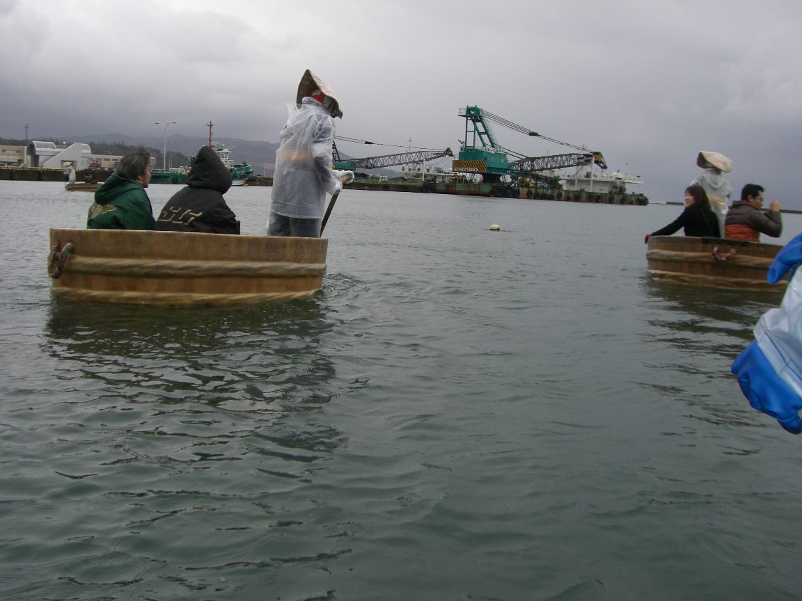 悪天候で結構波は高かったのですが、湾の中なので殆ど波はありませんでした。私はもっと海の中でたらい舟に乗るのかと思っていたので、こんなに陸に近い所なのかと少しがっかりしました。それでも天気の良い日だと気持ち良さそうです。たらい舟は自分で漕がせても下さいます。柄の端にT字型の持ち手がついたボートのオールのようなもので漕ぎます。上手に八の字に回すと前に進むそうですが、私は全然だめでした