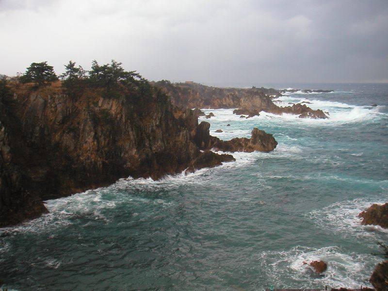 初上陸!2泊3日佐渡の旅(→旅程←)、尖閣湾揚島遊園観光です。揚島遊園は尖閣湾内の揚島峡湾にあります。普段はとても静かな海なのだそうですが、この日は悪天候で波が高く波浪に浸食されて生まれた荒削りの断崖と荒々しい日本海を堪能できました。ツアーの為、見学時間に制約があったのが残念でなりません。もうちょっと長く滞在したかったです。(写真をクリックしていただくと少し大きくなります。)