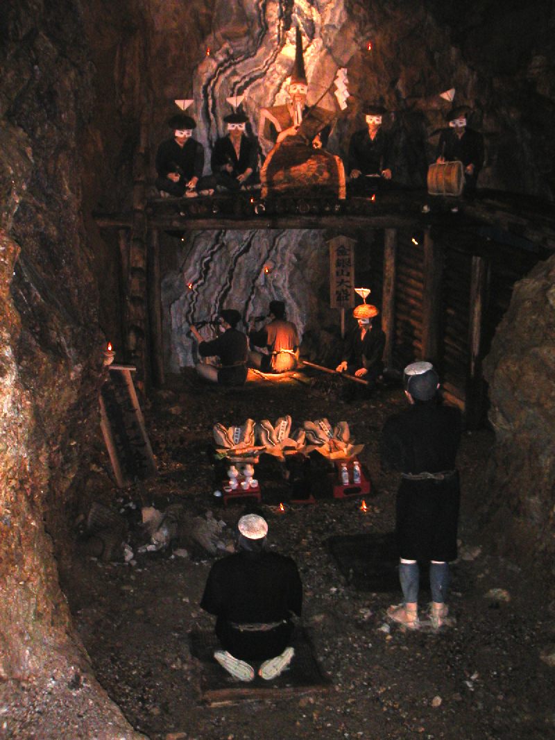坑道は江戸時代に採掘されていた実際の坑道“宗太夫坑”の一部なのだそうです。ロボットや人形でて江戸時代の鉱山の様子が再現されています。坑道の出口手前の「やわらぎ」(写真下)は山の神の心を和らげ、安全に採掘できるよう、また鉱脈が軟らかくなることを祈る神事芸能なのだそうです。