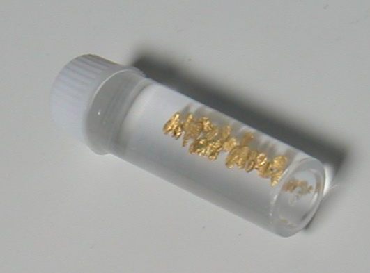 二人で採った砂金を一緒に入れています。ケースは円柱で直径1cmx4cmほどの大きさです。ケースを横に降ると結構音がします♪