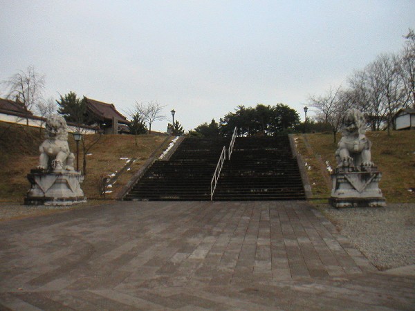 傾斜の階段。右手に“動く歩道(片道:¥300だったような...¥250かも)”の料金所があります。飯盛山自体は無料です。今回は全員で楽して“動く歩道”を利用する事に(笑)動く歩道の終点から階段20段程で到着です。階段を上ると広場のような開けた場所にでます。左手に白虎隊のお墓や戊辰戦争で犠牲になった方々の慰霊碑、右手にも海外から送られた慰霊碑などがあります。更に右手に行くと飯沼貞雄爺のお墓があります。白虎隊自刃者中、唯一、蘇生した飯沼少年によって“白虎隊”が世に知られるようになったのだそうです。上手く言い表せないけど、飯沼さん、生きてくれて、伝えてくれてありがとうございます。貴方のその勇気と強さに私は強い感銘を受けました。その奥に白虎隊自刃の地があります。戦による極度の緊張と疲労の中、この高台で身を休めていた少年達は(近所の侍屋敷の火事によるものだったそうですが)鶴ヶ城が煙につつまれているのをみて落城したと勘違いして、最後まで会津武士らしくあろうと自刃したのだそうです。現在、目前には市街地が広がっています。その奥に鶴ヶ城があるのだそうですが、既に辺りが暗くなっていた事もあり、私は鶴ヶ城をはっきりと見つける事ができませんでした。白虎隊もこんなおぼろげな感じだったのかな? なんとも切ないなぁ~