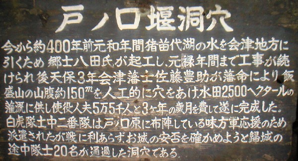 さざえ堂から少し下ったお宮(厳島神社だったかな?)の奥に戸ノ口堰洞穴があります。戸ノ口堰洞穴は猪苗代湖の水を会津地方に引くための灌漑用水なんだとか。戸の口原の戦いに破れた白虎隊がこの洞穴を通って引揚、鶴ヶ城の状況を確認しようと飯盛山に辿りついたのだとか。(画像をクリックして頂くと多少大きくなります。)