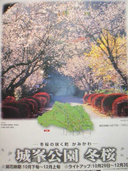 ここの売店は、観光地にしては珍しくお野菜がお安かったです。里芋やキュウイ、おにぎりとおまんじゅうを買っちゃいました(笑)売店の方に聞いたら、今年は例年に比べ開花が早かったのだそうです。私達、又、NHKにやられた(?)ようです。ライトアップの期間が翌日までという事を考えると、確かにちょっと遅すぎなんでしょうね。もっと早く来るべきでしたね。ポスターだとこんな感じなんですよ。完璧な時期に来るとこんな寒桜がみれるのかな???(笑)